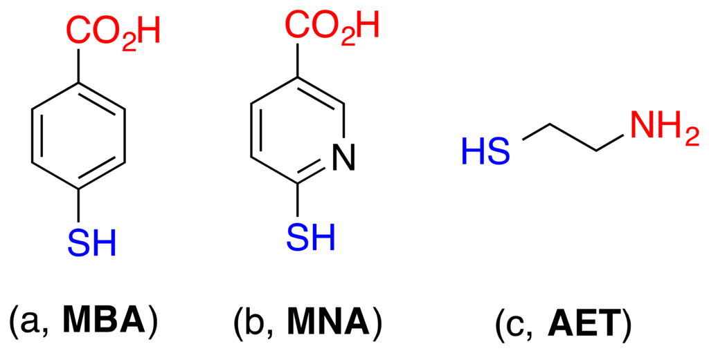 The surface modification of cantilevers was performed according to standard procedures [15]. The cantilevers were cleaned in acetone and then in ethanol, followed by a deionized water wash prior to the modification. A degased ethanol solution of 4-mercaptobenzoic acid, 6-mercaptonicotinic acid, or 2-aminoethanethiol (6 × 10−3) (see Figure 2) were prepared in glass vessels, respectively, which were previously cleaned with piranha solution (3:1 H2SO4/H2O2) (Caution! Piranha solution can react violently with organic compounds and should be handled with care). The clean, gold-coated cantilevers were immersed in the thiol solutions for 24 h at 25 °C. After the completion of the modification, the cantilevers were rinsed with absolute ethanol and blown dry with argon before use.
