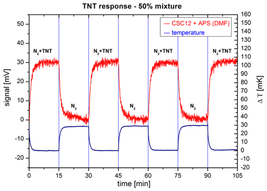 To verify that the cantilever bending is indeed the consequence of the surface adsorption of target molecules with the APS active layer and not due to a bimetal effect or some other temperature-related change in the measuring system, we changed the temperature of the clean N2 gas by a few tens of mK. Figure 6 shows the response of the same cantilever on switching between a clean N2 gas and a 50% saturated vapour pressure of TNT. The measured temperature changes of the clean N2 gas are of the order of 30 mK, while the functionalized cantilever response remains almost unchanged at about 32 mV.