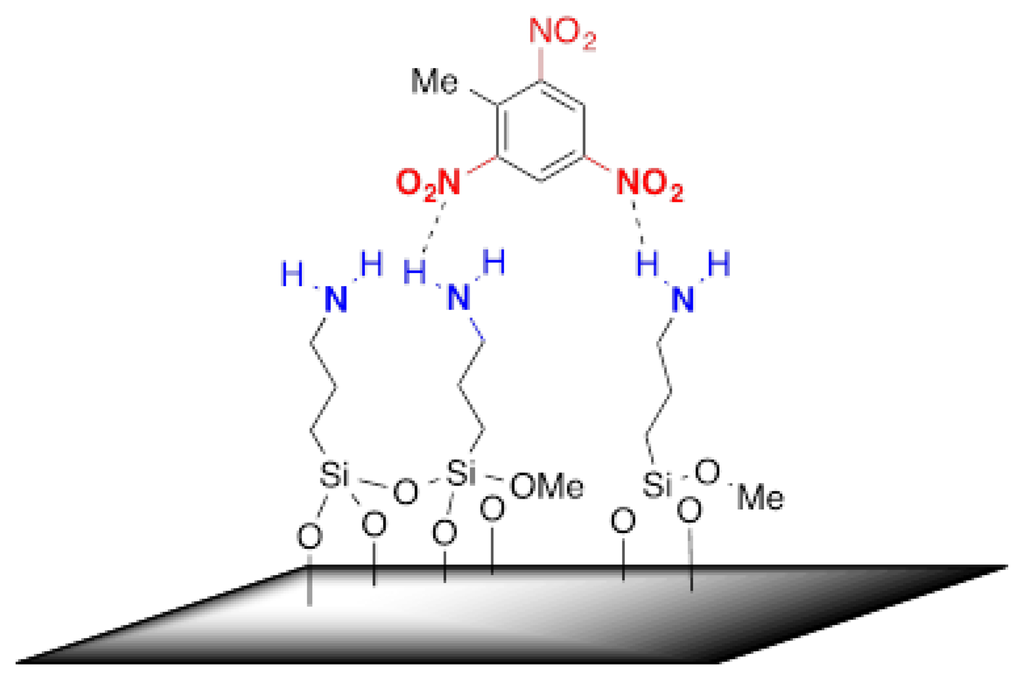 In our experiments, we selected a surface modification using 3-aminopropyltrimethoxysilane to recognise –NO2 containing explosives trough the hydrogen bond interactions between the NH2 and –NO2 functional groups [22], as shown in Figure 9. Moreover, the partial charged complex pairs are not excluded, resulting in enhanced sensitivities in the sensing of TNT molecules [23]. Furthermore, the modified surface also provides a unique stereo selectivity to the meta-nitroaromatics.