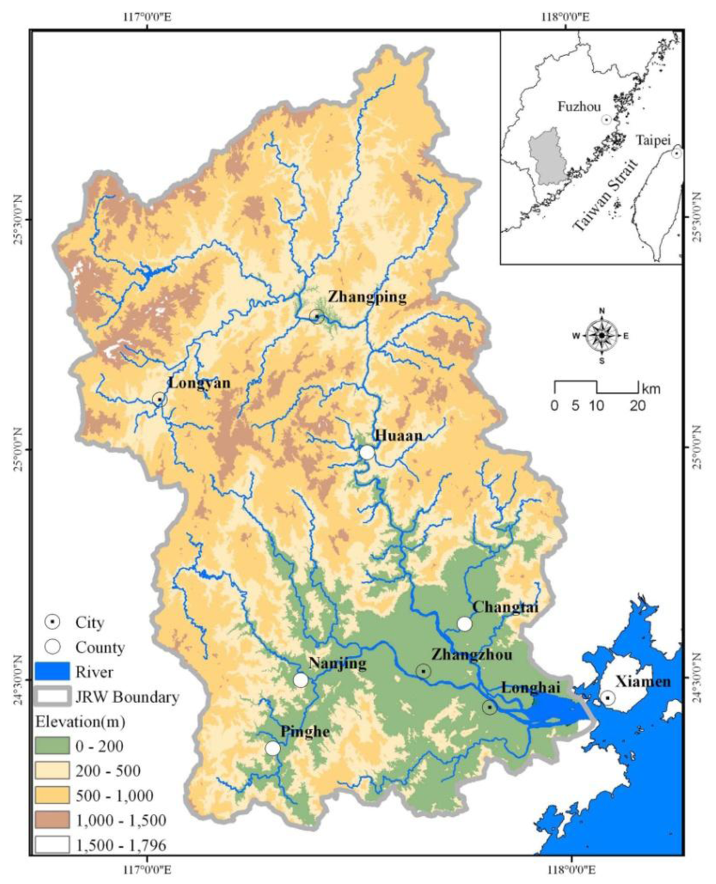 The JRW covers about 14,700 km2 in the eastern coastal area of China and consists mainly of eight counties/districts: Zhangzhou, Xinlou, Zhangping, Hua'an, Changtai, Pinghe, Longhai and Nangjing (Figure 1). The watershed's gross domestic product accounts for a quarter of Fujian Province's economic output. Approximately ten million residents from Xiamen, Zhangzhou and Longyan use the Jiulong River as their water source for residential, industrial and agricultural activities.