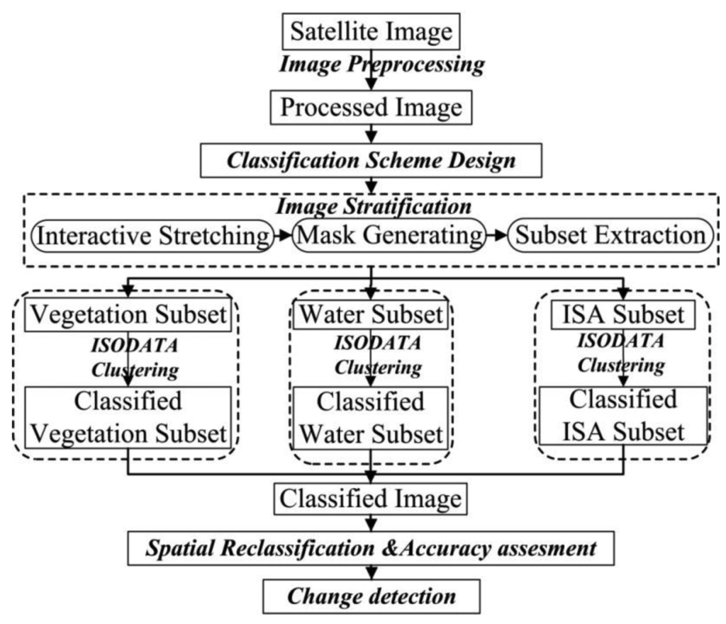 The determinants of LULC classification performance include the classification algorithm, characteristics of the study area, the classification scheme, the pixel spatial resolution, and the quality of the reference data [37]. Stratified classification in this paper extracted subsets based on spectral features and then classified each subset in a same scheme. This is different with hierarchical classification, which classified images in hierarchical way [38,39]. Other studies have also used stratified classification and spatial reclassification procedures to suppress the confusion in spectral signals [21,40]. Liu and Yang [21] stratified the entire landscape into rural and urban subsets and then classified each subset independently by using multiple endmember spectral mixture analysis. The completeness and temporal accuracy of the road network data are critical for the success of landscape stratification in Liu and Yang's study. Unfortunately, we were not able to obtain accurate road network data for the same year as the satellite images. Instead, we took the spectral features of vegetation in the red band and water in the short-wave infrared band to make two masks. The image was then partitioned into three subsets. Therefore, our image stratification doesn't need ancillary data to clip the image. We adopted ISODAT clustering to process each subset, because we were not able to gather enough previous information about our study area.