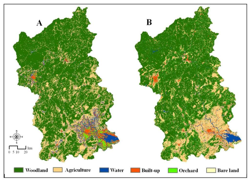 The Technology Regulation of Land Use Survey (1984), regulated by the Ministry of Land and Resources of the People's Republic of China, recommends that LULC be classified into Agriculture, Orchard, Woodland, Grassland, Residential area, Transportation, Water and Bare land. We created a modified version of six categories of LULC based on image spatial resolution and field surveys (Table 2).
