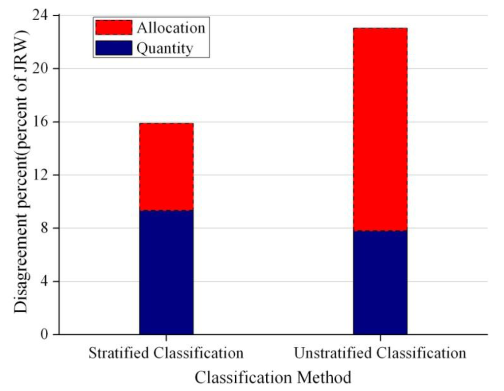 In terms of each category, agreement for a particular category is where both the reference information and the classified map indicate the particular category. Omission disagreement for a particular category is where the reference information indicates the particular category, but the classified map shows a different category. Commission disagreement for a particular category is where the classified map shows the particular category, but the reference information indicates a different category. If the commission disagreement is greater than omission disagreement for a particular category, then the map overestimates the quantity of that category. If the omission disagreement is greater than commission disagreement for a particular category, then the map underestimates the quantity of that category [36].