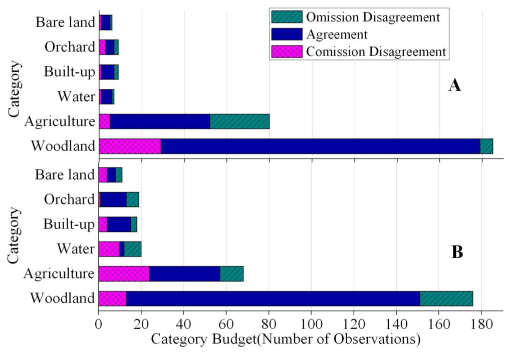 Figure 5 summarizes the agreement, omission disagreement and commission disagreement by category for each of the stratified and unstratified 2002 LULC maps. Vertical axis shows the categories while the horizontal axis shows the number of validation observations. The sum of omission and commission disagreement for the stratified classification is smaller than the sum for the unstratified classification for each category. Figure 5A shows that the commission disagreement is greater than omission disagreement for Woodland and Orchard, thus those two LULC types were overestimated by the stratified classification method. In contrast, Agriculture and Built-up were underestimated. Figure 5B shows that all LULC types except for Woodland and Built-up were overestimated when using the unstratified classification.