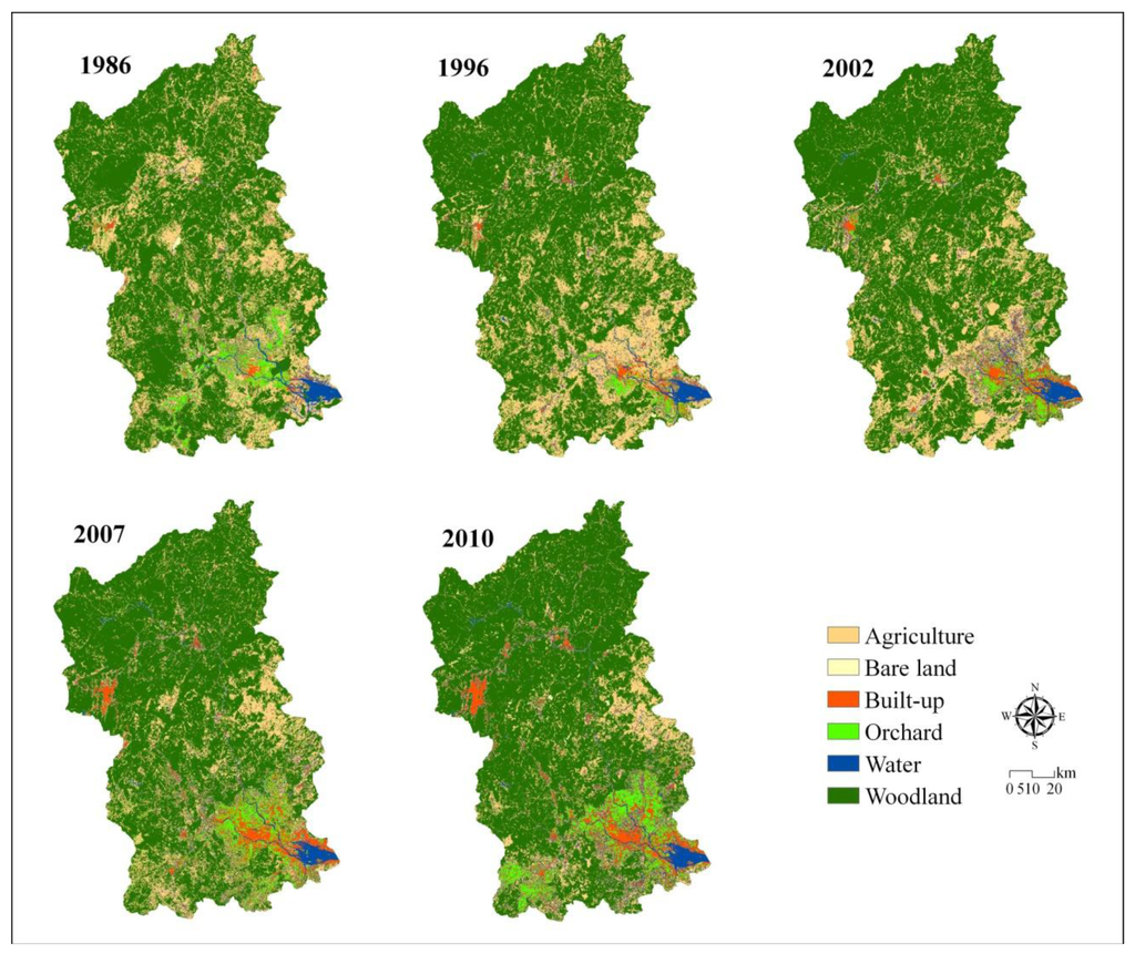 Figure 6 shows maps from the stratified method for five time points. Built-up increased while Agriculture decreased during all time intervals. Orchard increased since 1996. Woodland increased except during 2002–2010.