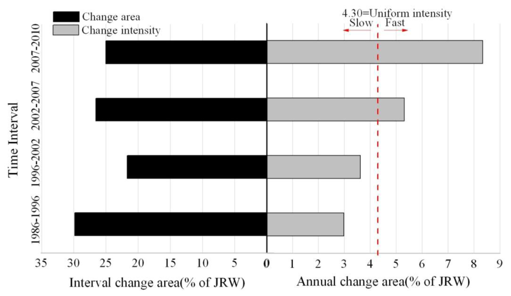 Intensity Analysis showed that land transformation has been accelerating across the four time intervals, which is consistent with accelerating economic development in this coastal watershed of Southeast China. This finding is similar to our prior study [41].