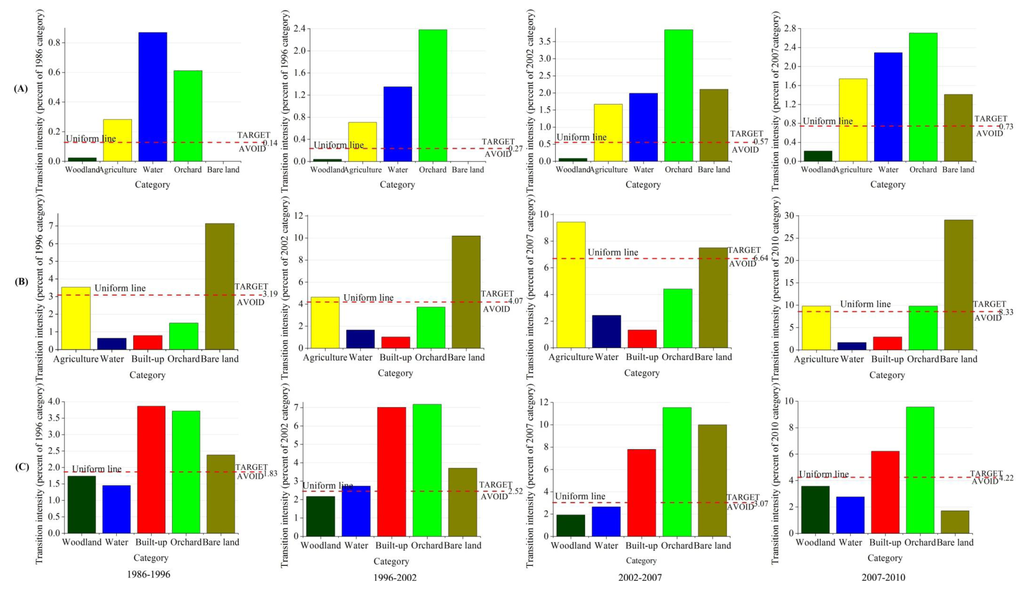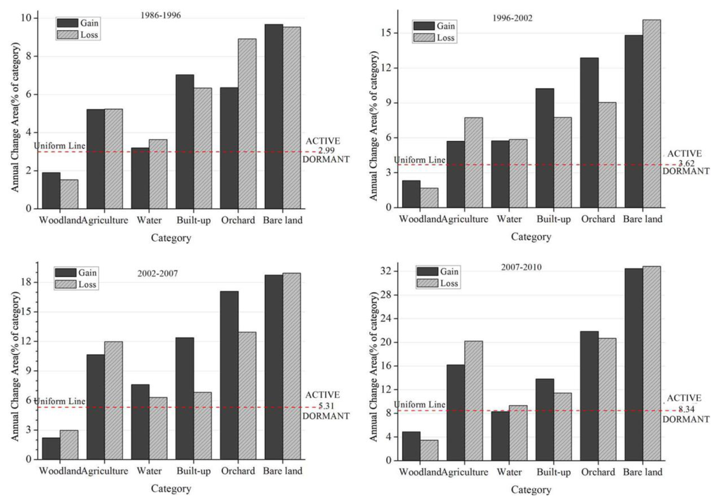 Woodland's gains and losses were dormant while the gains and losses of Agriculture, Orchard, Built-up and Bare land were active for all time intervals. This indicated that Woodland experienced less intensively gains and losses than if the overall change were to have been distributed uniformly across the landscape. Similarly, Agriculture, Orchard, Built-up and Bare land experienced more intensively gains and losses than if the overall change were to have been distributed uniformly across the landscape. These results are consistent for all four time intervals, meaning that the pattern is stationary at the category level intensity analysis. Water experienced gains more intensively than the landscape in general except for 2007–2010 and experienced losses more intensively than landscape in general across four time intervals. This indicates that Water's losses were stationary while its gains were not.