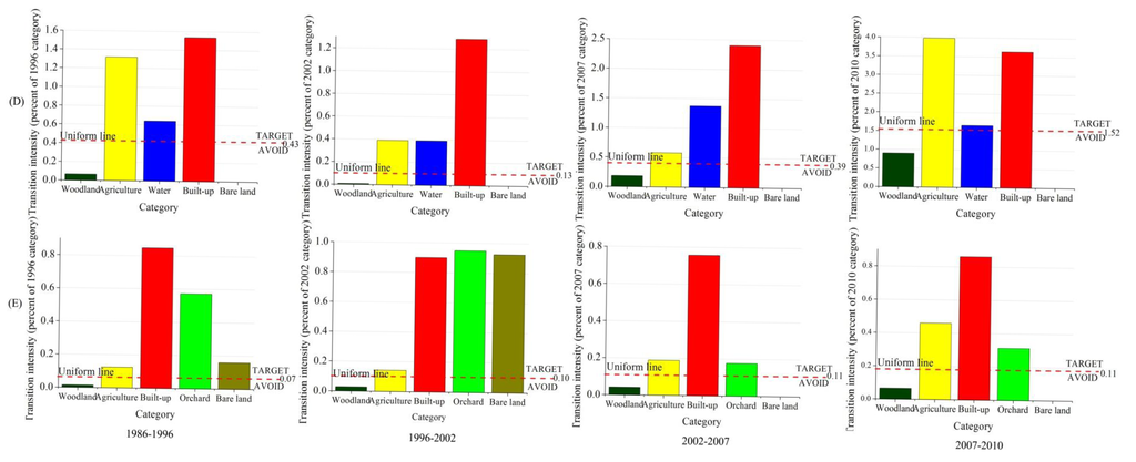 In terms of transition level intensity analysis, we focused the transitions from Woodland, Agriculture, Orchard and Water to Built-up, as urbanization is a hotspot in the coastal regions throughout the world. Figure 9 shows the results for the transition level analysis in terms of transitions from Woodland, Agriculture, Orchard and Water to Built-up. The four graphs in Figure 9A show the analysis of the gain to Built-up. The horizontal axis shows the losing categories and the vertical axis shows the transition intensity to Built-up. The four lower rows in Figure 9 show the analysis of the loss of Woodland (B), Agriculture (C), Orchard (D) and Water (E). The horizontal axis shows the gaining categories and the vertical axis shows the transition intensity. Figure 9A shows that Built-up's gains target Agriculture, Water and Orchard and avoid Woodland for all time intervals. Therefore the transition from Woodland, Agriculture, Orchard and Water to Built-up is stationary, given the gain of Built-up. Figure 9B shows that Built-up avoids Woodland's loss for all time intervals. The three lower rows of Figure 9 show that Built-up targets the losses of Agriculture, Orchard and Water respectively for all time intervals. The transition from Woodland, Agriculture, Orchard and Water to Built-up is stationary, given the loss of Woodland, Agriculture, Orchard and Water respectively. In Figure 9E, Built-up generally targets Water's loss more intensively than the loss of other categories. This may reflect extensive reclamation in the Jiulong River estuaries in recent years. Intensity Analysis shows that transitions from Agriculture to Built-up, from Orchard to Built-up and from Water to Built-up are systematically targeting transition while the transition from Woodland to Built-up is a systematically avoiding transition.