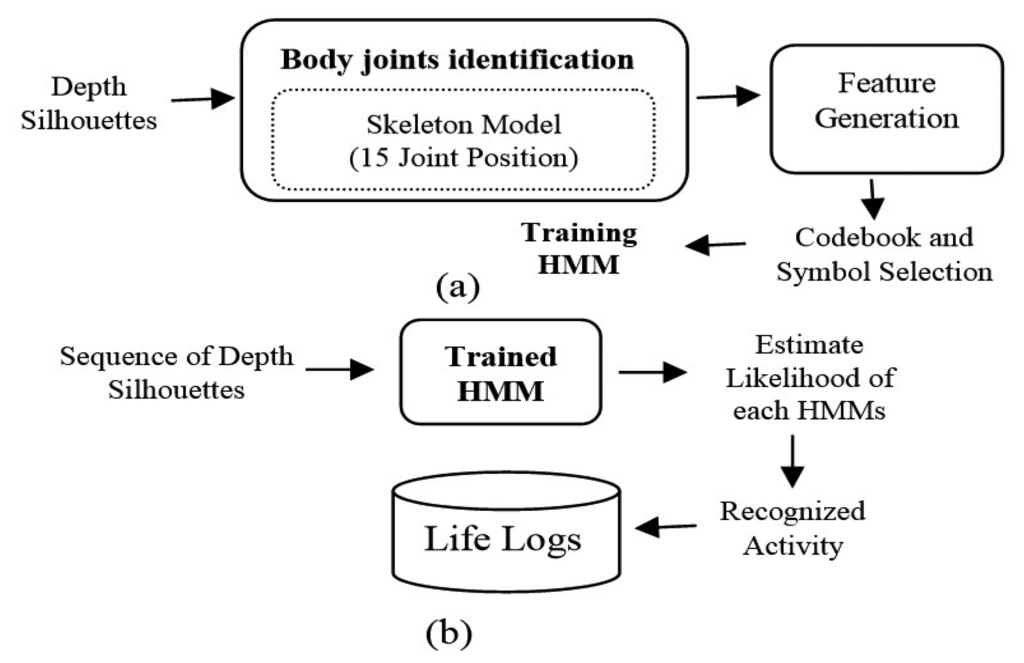 Our life-logging HAR system consists of depth silhouettes captured from the depth camera which are further processed for body joint identification, motion feature generation from the joint points and training them via HMM for HAR. An overview of the proposed life-logging HAR system is shown in Figure 1, where Figure 1a describes how to train the life logging system and Figure 1b shows how to generate life logs from the recognized activities.