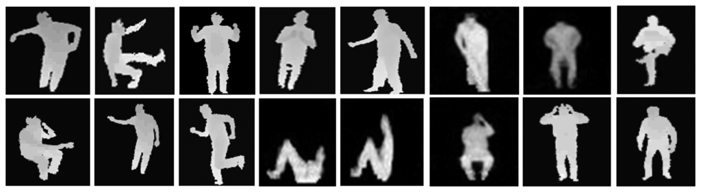 From Figure 2, it is obvious that the binary silhouettes do not seem good enough to differentiate these two different activities because the binary silhouettes deal with limited information (i.e., 0 and 1 values). However, depth silhouettes clearly differentiate body parts of different activities by means of different intensity values. Depth silhouettes also deal with hidden feature information which significantly improves the recognition results especially in case of closer activities. However, during silhouette-based HAR, depth silhouettes reflect a superior recognition rate than the binary one (see Section 3.5 below). Thus, due to the better discrimination of different activities of depth silhouettes, we considered the depth silhouettes for further processing in our life-logging HAR system.