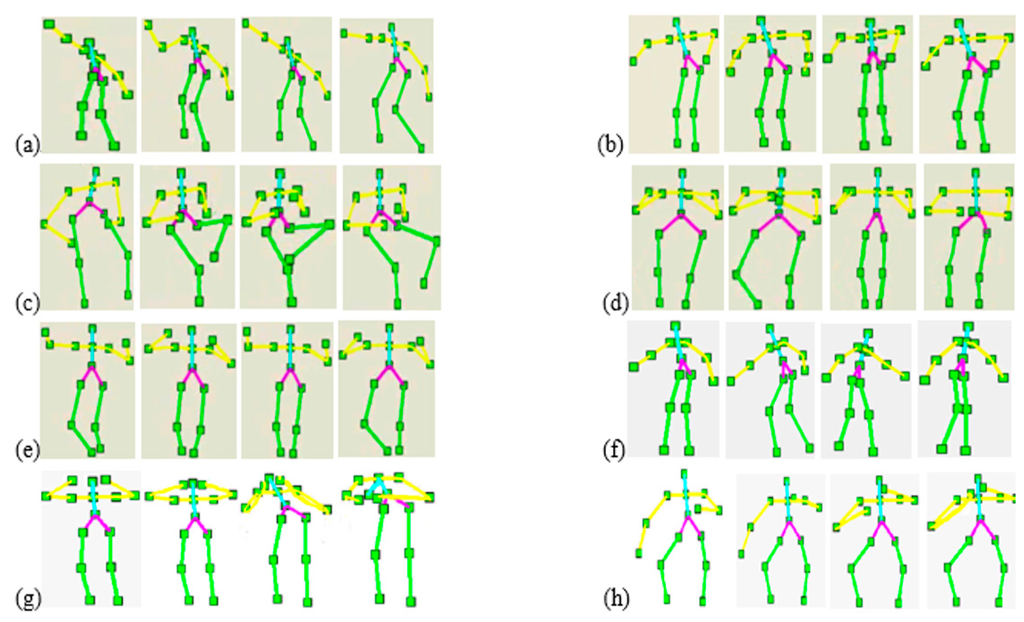 Figure 11. Skeleton representations that illustrate some of our results: (a) presentation; (b) cooking; (c) reading an article; (d) hand clapping; (e) exercise; (f) walking; (g) headache and (h) taking medicine.