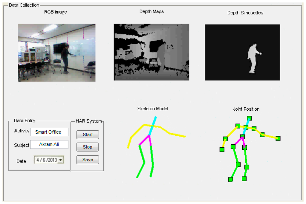 The training phase includes the data collection from the depth camera, computing motion parameter features and then training on the different activities via HMM. In data collection, the interface contains RGB images, depth maps having background, depth silhouettes and skeleton models with their respective joint points information, as shown in Figure 12.