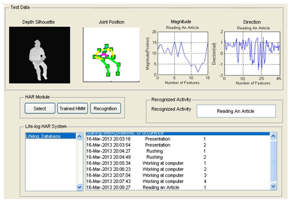 After HMM training, the trained life-logging HAR system accepts a sequence of depth silhouettes and generates the life logs by recognizing the learned activities, which stores information such as activity type, date, time, location and number of occurrence for future references.