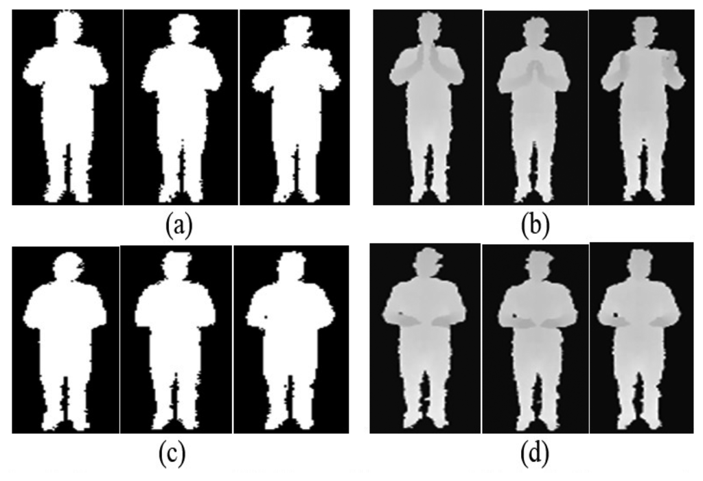 Initially, the system records users' daily activities from a depth camera that provides a sequence of depth silhouettes. The input sensor for our system is a Microsoft Kinect depth camera that provides RGB images and depth maps based on distance or depth information having noisy background and obstacles in the scenes. Thus, we applied background subtraction routine, tracking human depth silhouettes and produce body skeleton models for feature generation. In addition, we made a comparative study between binary and depth silhouettes to find the best silhouette nature [3133]. After getting the depth silhouettes, we converted it into binary silhouettes using a simple threshold values. Figure 2 illustrates examples of depth and binary silhouettes, where Figure 2a,b represents the sequential binary and depth silhouettes of a hand clapping activity and Figure 2c,d represents the sequential binary and depth silhouettes of a cooking activity, respectively.