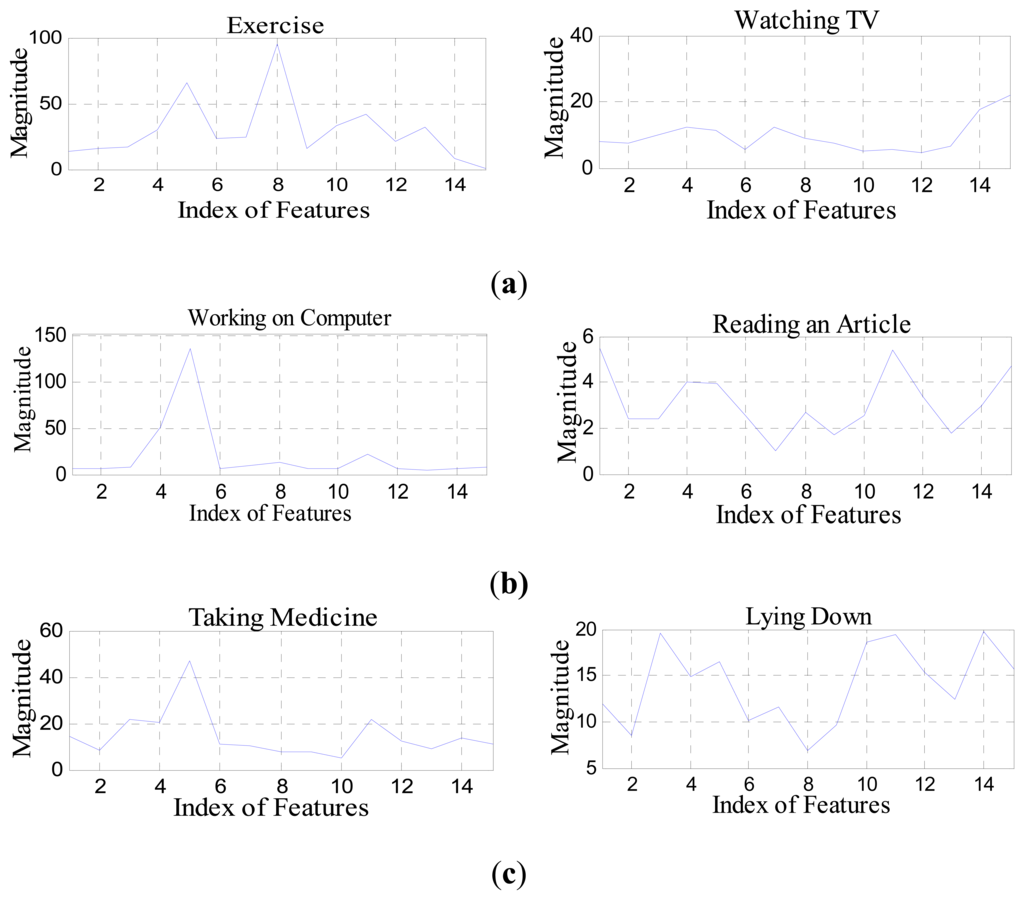 Figure 5 shows a set of magnitude features of human activities in various smart environment scenarios used in the life-logging HAR system, where (a) is exercise and watching the TV in a smart home environment; (b) is working on computer and reading an article in a smart office environment; and (c) is taking medicine and lying down is a smart hospital environment, respectively.