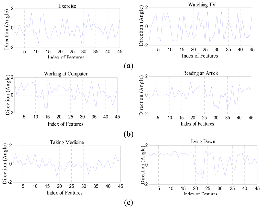 Figure 6. Directional angular features from the joint points of the body parts of human activities under the indoor environments. (a) smart home activities, (b) smart office activities and (c) smart hospital activities.