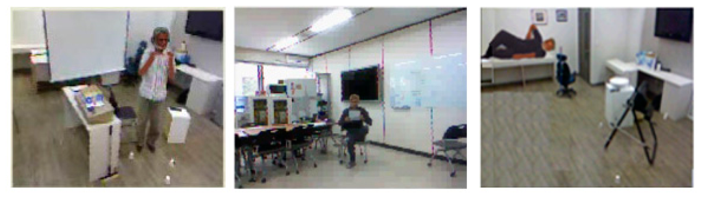 To evaluate our method, we constructed smart indoor activity datasets using the Kinect device. The videos were collected in home, office, and hospital environments, as shown in Figure 9.