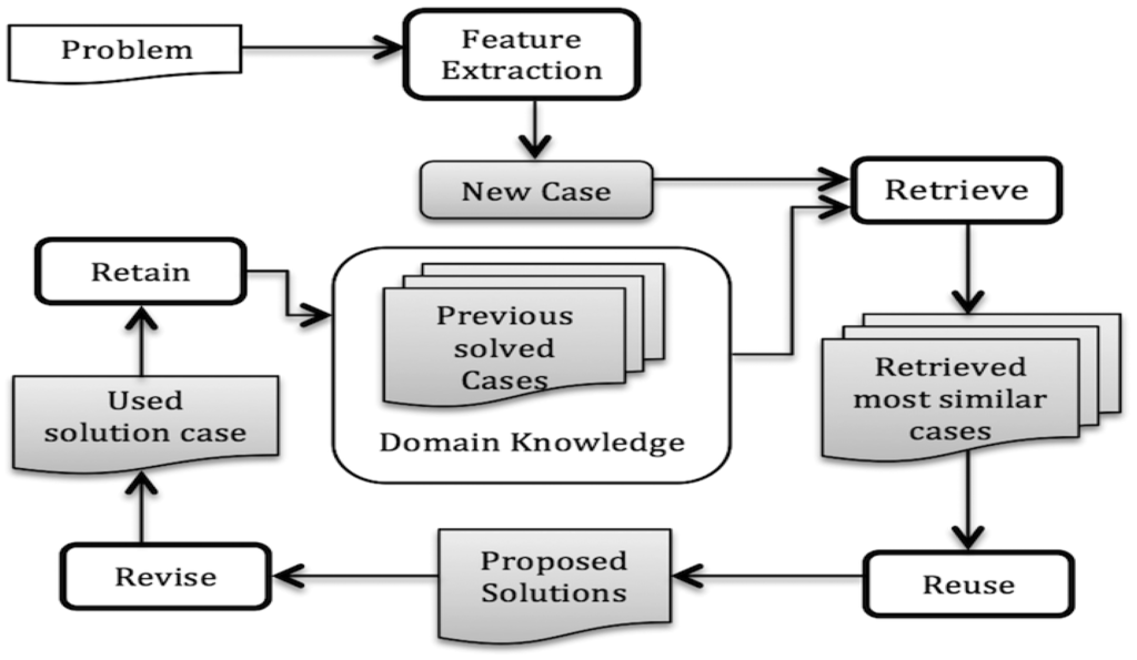 A case-based reasoning (CBR) [16,17] approach can work in a way close to human reasoning e.g., solves a new problem applying previous experiences, which is more common for doctors, clinicians or engineers. CBR has been applied successfully when the domain theory is not clear enough or even incomplete. It is getting increasing attention from the medical domain since it is a reasoning process that also is medically accepted [18–28]. For example, a clinician/doctor may start his/her practice with some initial experience (solved cases), then try to utilize this past experience to solve a new problem and simultaneously increases his/her case base. So, this method is getting increasing attention from the medical domain since it is a reasoning process that also is medically accepted. Aamodt and Plaza has introduced a life cycle of CBR [16] with four main steps as shown in Figure 2. Retrieve, Reuse, Revise and Retain present key tasks to implement such kind of cognitive model. In the retrieval step, for any new problem the system tries to retrieve the most similar case(s) by matching previous cases from a case base. If it finds any suitable case that is close to a current problem then the solution is reused (after some adaptation and revision if necessary).