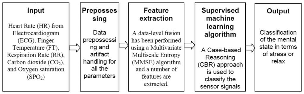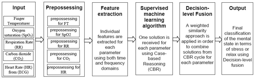 For the classification of the signals the approach works in two ways: (1) sensor signals classification using decision-level fusion; and (2) sensor signals classification using data-level fusion. In the decision-level fusion, features are extracted from each sensor signal separately through the traditional feature extraction approaches i.e., considering time and frequency domains features. Therefore, in the CBR system five individual case-libraries have been constructed based on the five physiological signals. In the case retrieval step, it retrieves the most similar case from each case-library by matching each individual signal, that is, for example, a new FT signal matches with the previous solved FT signals and retrieves the top most case and uses it as a solution to the current case. Thus, the approach retrieves five classes for five signals and a weighted similarity function provides the final classification. In the data-level fusion, the signals are combined by means of a Multivariate Multiscale Entropy (MMSE) algorithm where the algorithm provides us with a number of features. The features that are extracted then form a new problem case and this new case is then feed into the CBR cycle. Here, the retrieval step retrieves the top most case and classifies the five-combined signal into Stressed or Relaxed class.