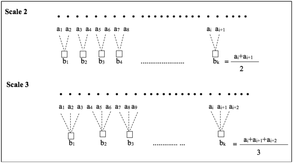 In this study, for MMSE analysis, embedding vector parameters are considered as mk = 2 and τk = 1 which are used in [3] for physiological signals. MMSE algorithm uses Equation (4) to obtain the coarse-grained process: