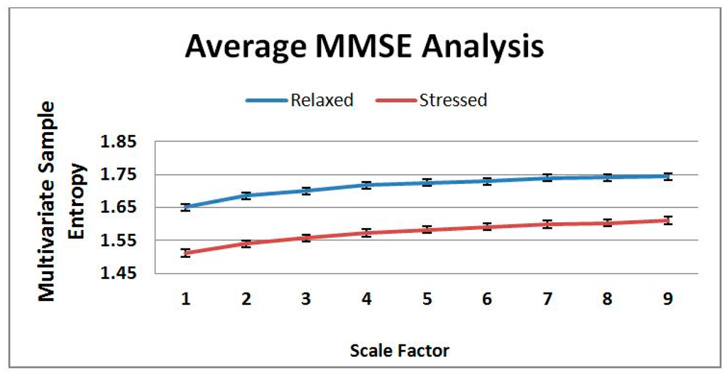 In this experiment, five sensor signals (Heart rate, finger temperature, respiration rate, oxygen saturation (SpO2) and CO2) have been fused using the MMSE and entropy complexity has been computed up to scale 9. Then, an average entropy complexity value for each scale has been calculated both for the Stressed and Relaxed classes.