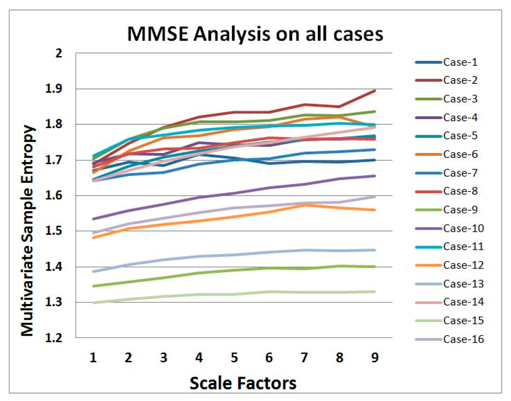 The MMSE analysis returns a linear vector based on the scale factor. To calculate MSampEn, for each p -variate time series a composite delay vector has been constructed using Equation (5):