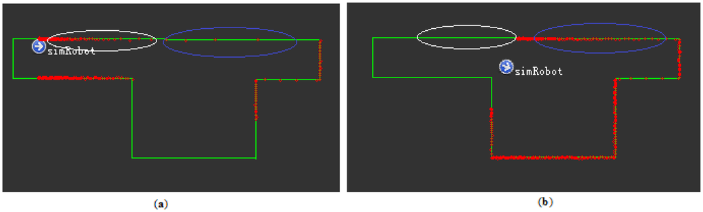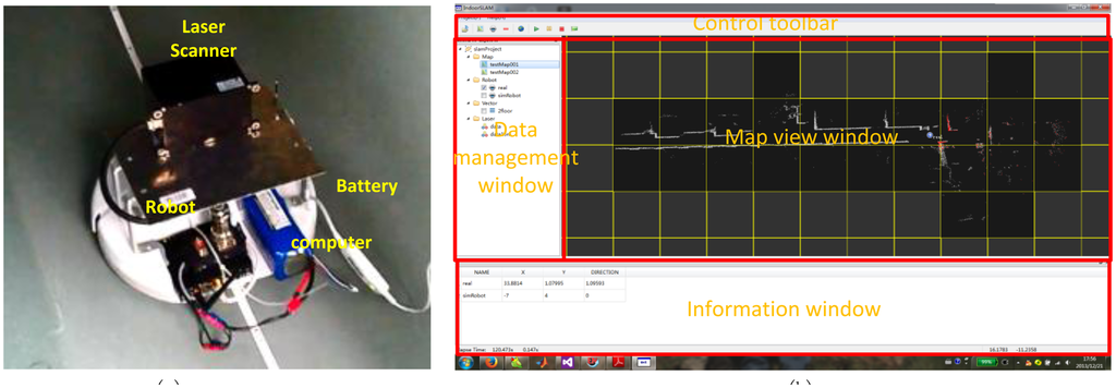 In order to identify the simulated results and verify the proposed idea, a UGV platform called NAVIS was designed, implemented, and tested based on a home vacuum-cleaning robot (see Figure 6a)—iRobot®, which was then equipped with an odometer and determined to be capable of carrying a maximum payload of 5 kg. An “IBEO LUX” laser scanner was adopted for the tests; this device has a field-of-view of 110° with 0.25° angular resolution and a scan frequency of 25 Hz, and at maximum an effective range of 90 m indoors. The laser scanner and the robot are both connected to an onboard computer (Fit-PC-2) with its RJ-45 standard network port and COM, respectively, for collecting data, which include laser scanning data, odometer measurements, etc. The entire mobile unit is powered by an external battery. During the indoor tests, the robot operated at a pre-set speed of 0.28 m/s.