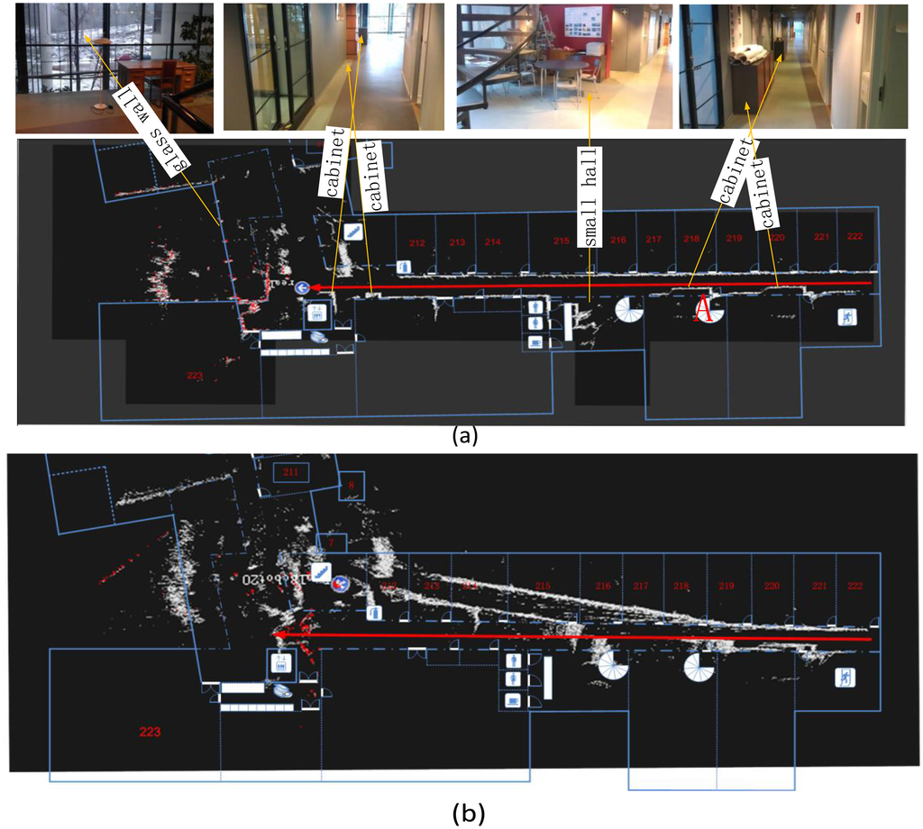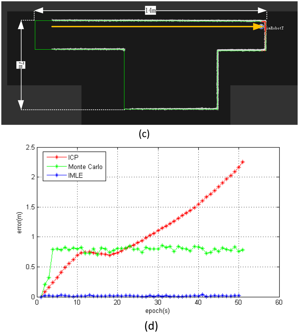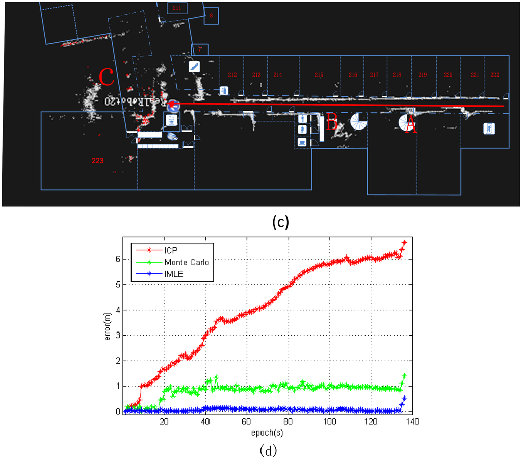 Figure 11a shows the result of the likelihood map for the IMLE algorithm. Compared with the geographic map extracted from the construction blueprint, the skeleton of the corridor was accurately recognized. At the end of trajectory, the glass wall, the glass handrails, and plants caused a lot of noise measurements, which result in degraded positioning. Most of the scan points penetrated the transparent glass wall at the end of the corridor. But the line feature of the glass wall was still recognizable from the opaque window frame. Therefore, the transparency of the objects significantly affects the positioning and mapping result. Figure 11b,c shows the results of the likelihood map with the ICP and the Monte Carlo algorithms. The two algorithms behaved in the same manner as in the simulated experiment: the heading angle deviated quickly with the ICP algorithm; but the Monte Carlo algorithm easily fell into the local optimum, which caused accumulating errors and led to inadequate position results and mapping results. For example, the map feature ‘A’ in Figure 11c was much noisier than the same feature in Figure 11a, which was the local optimum position calculated by the Monte Carlo algorithm and the insufficient position resulted in incorrect mapping. Figure 11d compares the errors of the ICP, the Monte Carlo, and the IMLE algorithms in the field tests. The onboard odometer's outputs during the test were utilized as reference values. The error increased abnormally during the last few epochs on the trajectory regardless of which algorithm was adopted. The explanation for such phenomenon is the noise introduced by the glass walls and by plants, which had the effect of increasing the uncertainty of all algorithms' outputs. In those parts of the corridor with rich features for matching, the positioning RMS errors of the ICP, the Monte Carlo, and the IMLE algorithms were 4.4 m, 0.86 m, and 0.09 m. Table 1 shows the positioning error statistics. The obtained trend coincided with the simulated results. However, the accuracy of the IMLE algorithm was poorer than that of the simulation. The reason for this may be in the field of view of the selected LiDAR having been 110° against 180° in the simulation, and this means that fewer features were extracted in the field test. The difference in features between the simulation and the field test may be another reason.