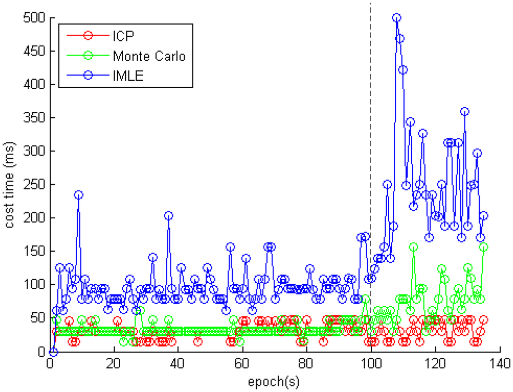Figure 12 and Table 2 show the time cost on each scan matching when using the different algorithms. The average cost times of the ICP, the Monte Carlo, and the IMLE algorithms were 32 ms, 45 ms, and 112 ms, respectively. It is obvious that the ICP and the Monte Carlo compute about twice as fast as the IMLE on the premise of sacrificing position accuracy. And there is the phenomenon that the IMLE costs much more after about 100 s. Because there were a lot of glass features in the environment at the end of the trajectory, the introduced noisy laser scanning point cloud makes the scan matching processing more difficult. The IMLE algorithm adaptively searches for the result over a larger scope. The average cost time is about 80ms with enough matching features in 100 s. Since the UGV platform is running at a slow but steady speed of 0.28 m/s, and the positioning frequency is 1 Hz, the proposed method can finish the positioning process even under the worst conditions. The positioning frequency of the proposed NAVIS platform can reach 12 Hz in a feature-rich environment and 2 Hz even in a feature-poor environment. Therefore, it could be utilized in real-time applications.