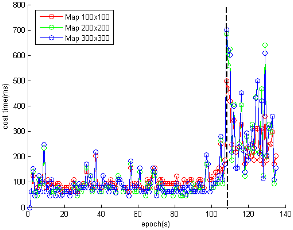 As is mentioned above in Section 3.5, position accuracy partly depends on the resolution of the likelihood map; the higher the accuracy, the higher the required map resolution. While the average area of a typical office building is approximately 100 × 100 m which covers most indoor mapping applications with some supermarkets being even larger, we believe that the area dealt with should be smaller 300 × 300 m. Considering 1 cm map resolution as being selected, the computer needs to be capable of storing and retrieving a huge amount of data in real-time positioning applications. The field tests conducted in the course of the present study proved that the proposed multi-resolution patch-divided likelihood map method can solve this problem. Figure 13 and Table 3 show the time cost and data amount comparisons for different likelihood map sizes with 1 cm map resolution. The data amount grows according to the Index law. However, the time cost per scan matching and map updating do not growing with increasing map size, but keeps constant at approximately 130–140 ms because the map data are loaded into memory dynamically. While there is a critical high point in Figure 13, indicated by the black dashed line, the processing time for the maps of 200 × 200 m and 300 × 300 m costs 200 ms more than that for the map of 100 × 100 m. The reason is that another map patch is need by the scan matching processing and such map loading requires extra time. Above all, the proposed map can support large-area indoor positioning and mapping in real-time applications.