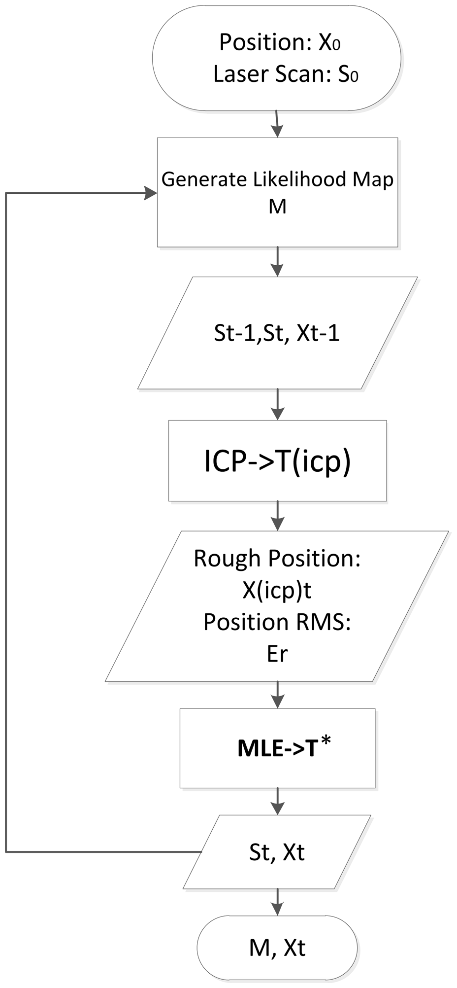 The flow chart of our fusion positioning algorithm is shown in Figure 2. Given the initial position x0 and laser scan S0, an initial likelihood map M is generated according to the line-feature-based three-level strategy for accurate feature representation. Then an iterator of the positioning and mapping process steps in: first, the original ICP utilizes two consecutive laser scans St−1 and St to calculate a rough rigid-body transformation Ticp, then a rough position x(icp)t with its corresponding RMS Er are computed out. Such parameters are used to evaluate the distance to the real position. Using this, we narrow down the search area for the MLE. Next, the MLE quickly refines the rough position making it the accurate position xt in the narrowed down search area of the multi-resolution patch-divided grid map. Finally, the likelihood map M is updated with xt and St. The details of each part will be introduced in the following context.