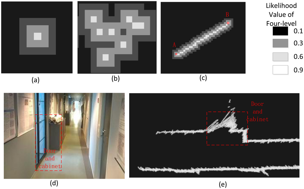The likelihood map is initialized with a grid with a given geographic boundary and resolution in the local reference. The grid cell is populated with any pre-defined likelihood values −0.1, 0.3, 0.6, and 0.9, which represent the likelihood of the environment gradually. All grid cells on the map are initialized with the likelihood value of 0.1, and each point of a new laser scan is projected onto the map grid cell. If any grid cell is occupied by a laser point, then a maximized likelihood value of 0.9 is given. We slope two grid cells around that cell and set the likelihood values as 0.6 and 0.3 outward respectively, as is shown in Figure 4a. The greater value rule is introduced to solve the overwrite conflict problem as is shown in Figure 4b. In order to solve the matching problem of spare points area in Figure 1, based on the aforementioned three-level likelihood value determination strategy, a line feature is extracted by simply connecting two ordered points within a certain distance in the laser scan, which could describe the environment more accurate. Figure 4c shows the extracted line feature from the ordered scan points A and B. Figure 4d,e are examples presenting such projection relationships in the real environment.