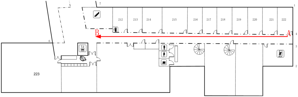 We also discuss the positioning results of field tests based on the ICP, the Monte Carlo, and the IMLE algorithms to further verify the proposed methodology. All of the field test data were collected along a corridor on the second floor of FGI's main building. Figure 8 shows the overview map of the corridor and the experimental trajectory. The length of the experimental trajectory was approximately 38.5 m. Therefore, the area of the likelihood map could be given as 80 × 80 m considering the maximum range of the laser scanner.