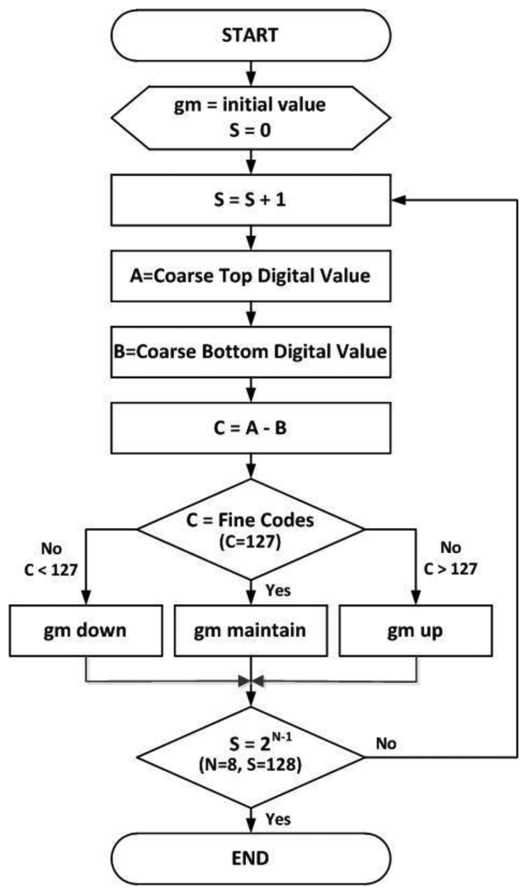 Figure 10 shows the flow chart of the proposed self-calibration technique. The slope correction between the coarse ramp and the fine ramp is performed based on the flow chart. In the proposed TS SS ADC, the total codes of fine ADC are 256, because we use a DCL technique with the extra 1-bit of coarse ADC shown in Section 3.2. Thus the fine ramp covers the 2-bit LSB of coarse ADC. It means that the maximum range of fine ramp is 256, which is larger than 1LSB of coarse ADC. Therefore, it is possible that C = A − B can be smaller or larger than 127, as shown in Figure 10.