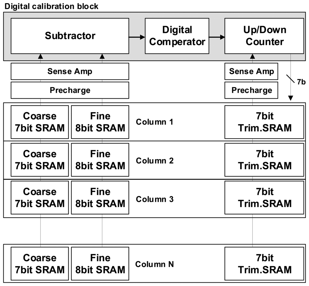 Figure 11 shows the block diagram for digital calibration. First, the initial values configured as default in the trim SRAM are entered into the analog calibration block to start the self-calibration. Then, the analog CDS switch is controlled to convert the lowest fine value of the coarse 1 LSB into the digital code and it is stored to the first memory. Then, the highest fine value of the coarse 1 LSB undergoes the A/D conversion and is saved to the second memory. The two data are subtracted by the subtractor. Here, the difference between the two data causes a change of the initial value configured in the trim SRAM, depending on whether the value is smaller or larger than the ideal 7-bit fine code value (127). The digital code transition in the trim SRAM changes the total amount of the current flowing in the analog calibration circuit and changes the gm value of Mfine. Repeating such methods finally makes the analog gain between Mcoarse and Mfine the same. As a result, we reduce drastically the CFPN caused by the difference in the analog gain between the coarse ramp and the fine ramp with the device mismatching error. The calibration technique used in this work is one of a foreground method. The foreground calibration is that all the column calibration has been done before the beginning of CIS operations. Thus there is no lowering of frame rate because of the foreground calibration. However, it takes a time for the calibration. Based on the measured results in this paper, it takes 1.25 ms for VGA pixels. Of course, the more the number of pixels is increased, the more the foreground calibration time is also increased. Nevertheless, most of the recent foreground calibrations are sufficiently finished during the CIS ready time, even in a huge pixel system.