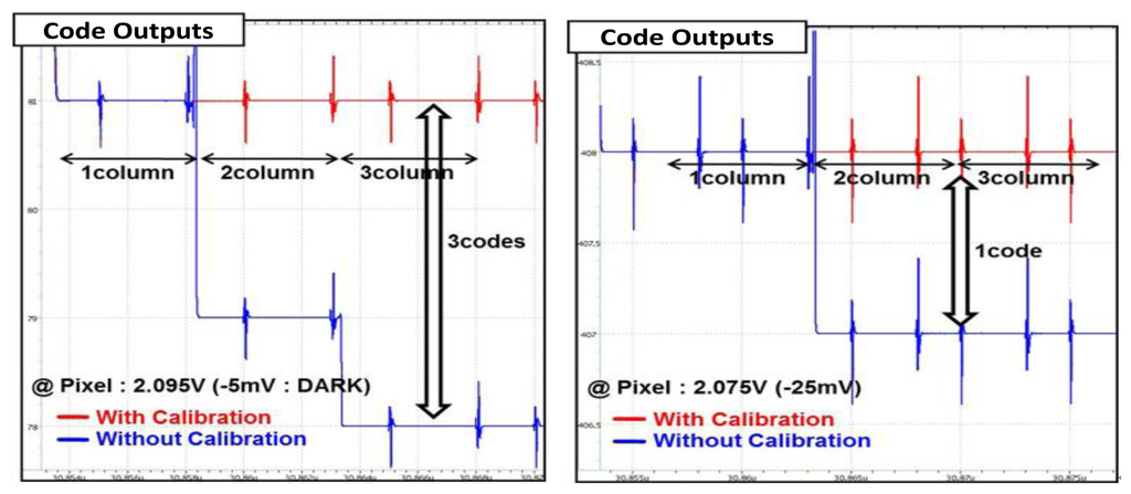 Figure 12 shows the simulated output values of the CIS with or without the self-calibration technique. We assume that the same input voltages are applied for each of the three columns with arbitrary mismatching error. For example, we assume that the pixel voltage is 2.095 V at the left figure, and it is 2.075 V at the right figure. From the simulation results, the code outputs of the image sensor without the self-calibration show different outputs for the three columns, even though the same input voltages are applied. It is said that the CFPN generates if the outputs for each column are different. However, we found that the three columns have the same output values, when the self-calibration technique is used. Therefore, the column self-calibration technique drastically reduces the CFPN.