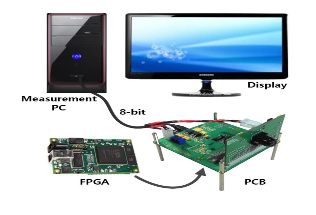 Figure 14 shows the configuration of measurement systems, and it is comprised of the board which contains the Xilinx-XEM 3050 FPGA and the board with the CIS of the Chip On Board (COB). The FPGA plays a role in generating the control signal for measurement, receiving the output data from the image sensor, and delivering the result to the PC through the USB interface. The transmitted data are handled in the PC to apply the processing of a real image. Here, unfortunately, the resolution of normal display is limited to 8-bit. Since the normal display systems such as LCD, LED display, and other ones are set to always 8-bit resolution, the testing for the 14-bit CIS has a problem. With a normal display, the 14-bit full-resolution of CIS cannot be tested. In order to overcome the problems, we divide and select the digital output codes of TS SS ADC from the FPGA one by one. For example, if we choose 7-bit coarse and 1-bit fine, the testing resolution is 8-bit. If we choose 3-bit coarse and 5-bit fine, the testing resolution is 12-bit. Assuming x-bit coarse ADC and y-bit fine ADC, we can obtain the testing resolution as follows: