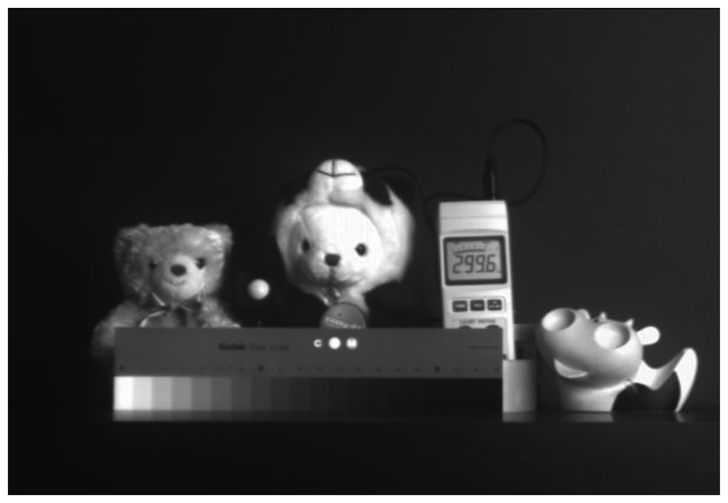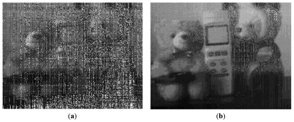 Figure 15 shows the measured VGA sample image with the condition of 7-bit coarse and 1-bit fine, namely 8-bit resolution. It achieves the frame rates of 120 fps at a main clock speed of 40 MHz. It shows a high image quality. Figure 16 shows the measured sample images with the condition of 1-bit coarse and 7-bit fine, namely 14-bit resolution. Figure 16a shows the sample image without the self-calibration technique. It shows very poor image quality due to the presence of high levels of random noise and of the CFPN caused by the degraded ADC linearity error from the analog gain difference between the two ramps. On the contrary, Figure 16b shows the sample images with the self-calibration technique. The ADC linearity is drastically improved as a result of the self-calibration of the analog gain difference between the two ramps. Therefore, the CFPN and the random noise in the image sensor were significantly reduced and an improved image quality was achieved.