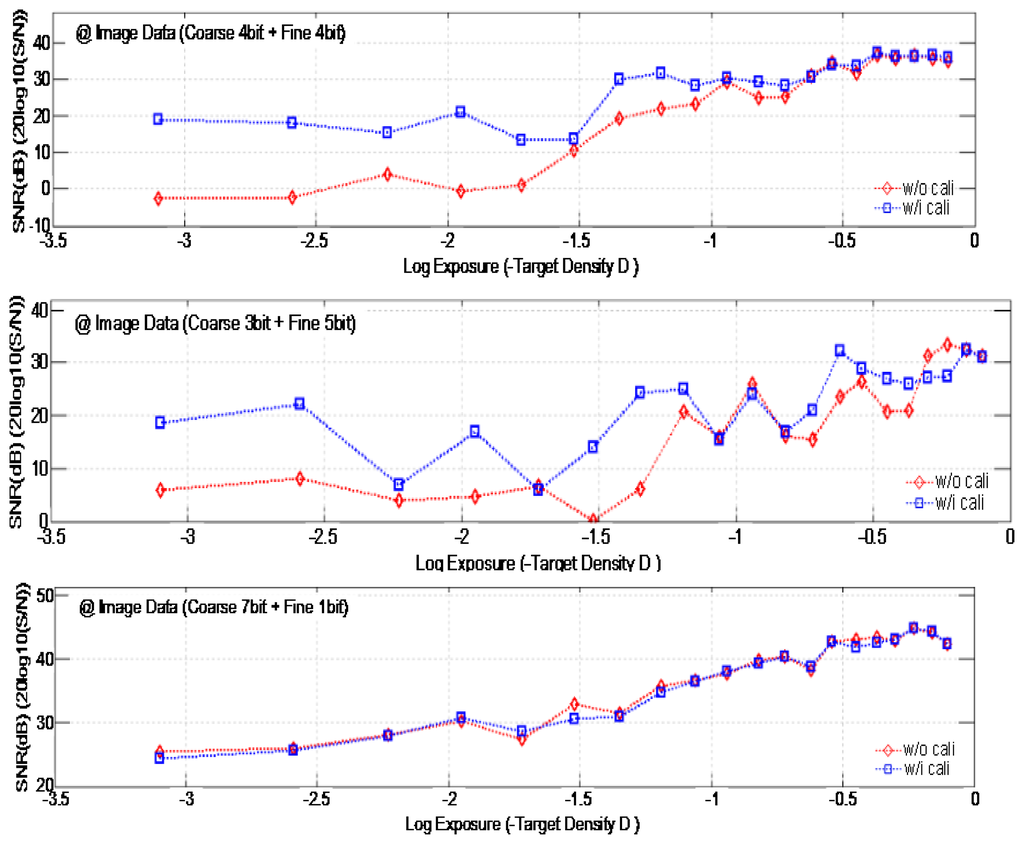 Figure 17 shows the measured SNR dependent on the amount of exposure with/without the self-calibration. The measurement uses the TE241-OECF noise test chart and the analysis is performed by using the IMATEST software program. If the image data is achieved with the condition of 7-bit coarse and 1-bit fine (namely, 8-bit ADC), the fine bit data is included into the only 1-bit. Thus there is not a large difference in the SNR before and after the self-calibration despite the analog gain difference between the two ramps. If the fine bit data increases to a 4-bit or 5-bit level, the difference of the analog gain between the two ramps degrades the ADC linearity more, and the SNR without the self-calibration becomes very low. If we use the self-calibration technique, however, it improves the SNR about by more than 10dB. Specially, the effect is more excellent at the low exposure region.