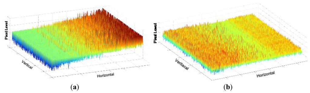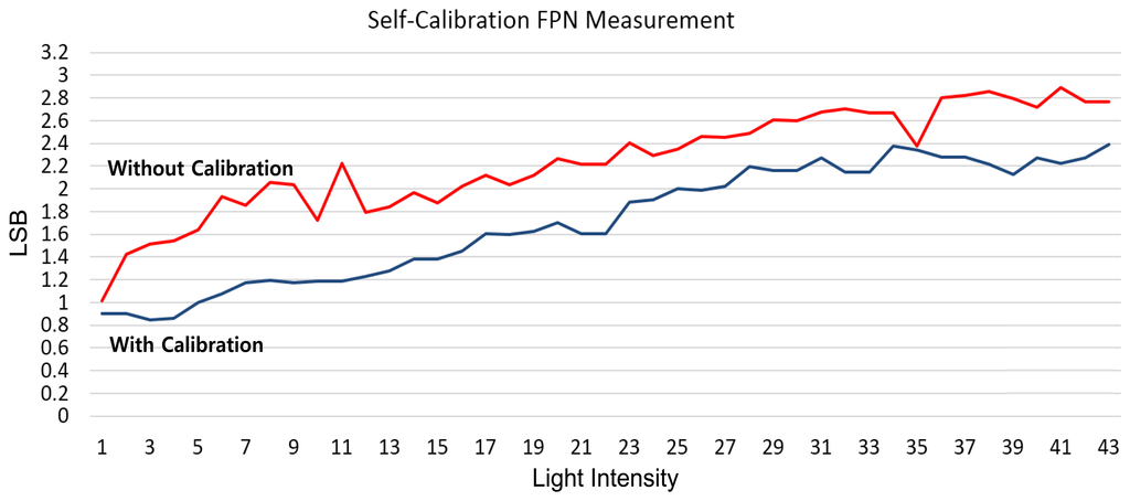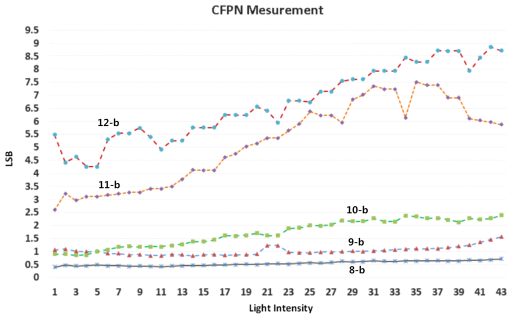 Figure 18 shows the measured CFPN dependent on the light intensity before and after the self-calibration at the 10-bit resolution. The average CFPN is reduced by about 0.4 LSB after the self-calibration. Figure 19 shows the measured results of the CFPN with the condition of the n-bit coarse and m-bit fine. Since the normal display system like a LED display is set to the 8-bit resolution, the addition of n-bit and m-bit is always 8. For example, the measured condition of the 7-bit coarse and 1-bit fine is 8-bit resolution, and the measured condition of the 3-bit coarse and 5-bit fine is 12-bit resolution. The measured CFPN of 8-bit ADC is 0.38 LSB, and the measured CFPN of 12-bit ADC is 5.5 LSB, respectively, at the dark region for the 10-bit resolution scale. Even in 13-bit or 14-bit, the measured results of CFPN cannot be obtained. Therefore, the measured performance of this work is about 10.5-bit, even though a 14-bit CIS was designed. The reasons why the measured result of 10.5-bit is obtained will be discussed in the conclusions. Figure 20 shows the measured results for the variation of the pixel level with/without the digital CDS shown in Figure 6. The pixel output level without the digital CDS becomes uneven and results in a high CFPN. However, the overall pixel output level becomes even when the digital CDS is used, and the CFPN is decreased.