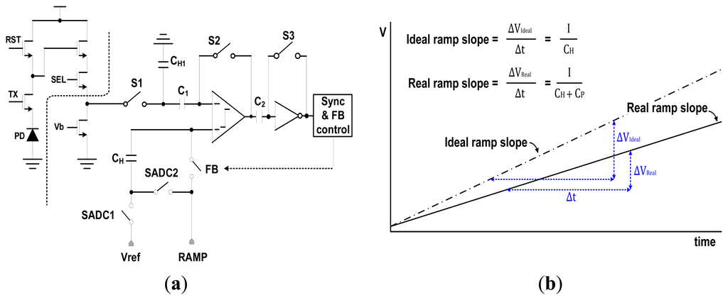Figure 2a shows the circuit diagram for an analog correlated double sampling (CDS) block with a conventional TS SS ADC [4]. It is composed of a comparator to compare the pixel signal with the ramp signal, four capacitors to perform the coarse A/D conversion and fine A/D conversion, a few switches, and a digital control block. From Figure 2a, the holding capacitor (CH) which stores the final coarse analog voltage is connected to the external ramp signals in a series. When the next fine ramp signal drives the comparator through the holding capacitor, the fine ramp slope is distorted by parasitic capacitances. Parasitic capacitances (CP) are inevitably formed by the switching MOS transistors, metal routing, and other side effects. Thus the real ramp slope is changed as follows:
