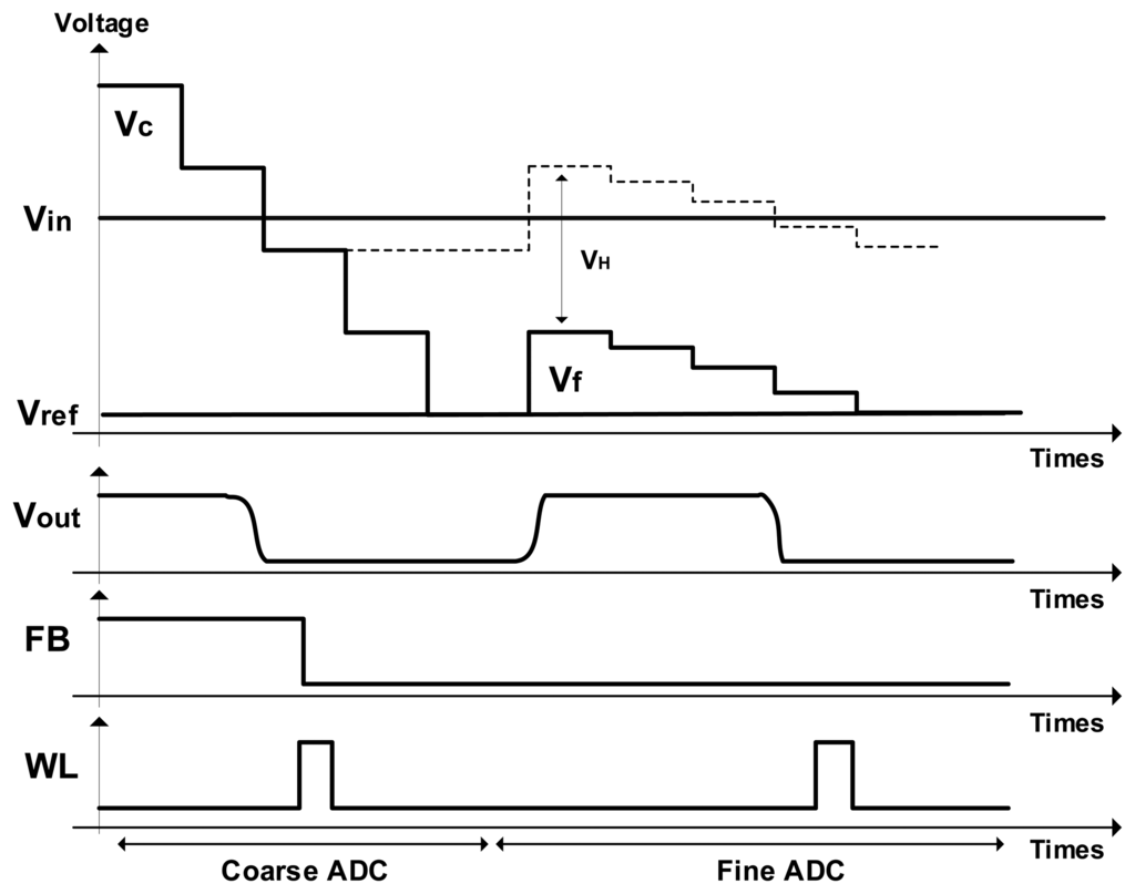Figure 4 shows the timing diagram of the TS SS ADC. It is a simple design example for 4-bit TS SS ADC with the 2-bit coarse ADC and the 2-bit fine ADC. In order to easily understand the principle of TS SS ADC, we use a very simple 4-bit design example. Even though this procedure is almost equal to that of the conventional TS SS ADC, the proposed TS SS ADC has some advantages. First of all, the input stage of the proposed TS SS ADC is very simple because of the 4-input comparator. Since the switches of SADC1 and SADC2 at the conventional TS SS ADC are eliminated, the switching noises are reduced by about 30%. This is because the total number of switches at Figure 3 is four, while that of Figure 2 is six. Based on the smaller number of switches for the proposed TS SS ADC shown in Figure 3, some errors such as clock feedthrough, charge injection, and other temporal noises at the switching MOS's are reduced by about 30%, compared to the conventional TS SS ADC shown in Figure 2. Further, in order or reduce the errors, we use a large holding capacitance where the value of CH is about 850 fF. From simulation results, the error at the large holding capacitance is very low to satisfy the 14-bit resolution, and the operating speed is enough to satisfy 120 fps. Secondly, very low offset errors generate because the voltage of Vref is directly connected to the input node of the comparator. Finally, the best advantage of the proposed TS SS ADC is an elimination of the serial holding capacitor shown in Figure 2. Since the holding capacitor is only used to hold the final voltage of the coarse ramp, the fine ramp slope is not affected by the parasitic capacitance. For this reason, the variation of fine ramp slope can be almost reduced.