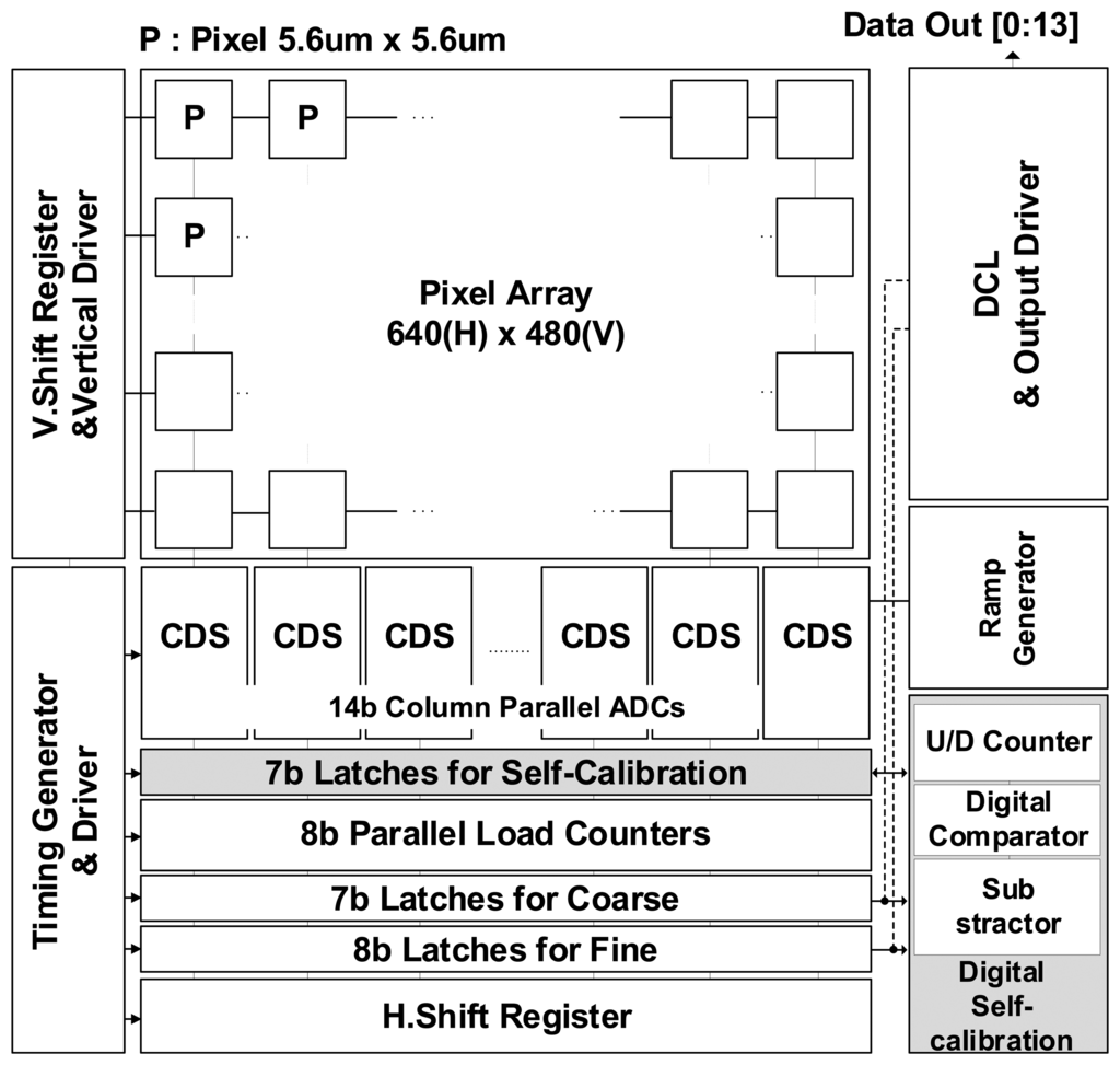 Generally, a CIS with a column parallel ADC structure consists of a pixel array, a Correlated Double Sampling (CDS) block with a column parallel ADC, and a digital control block. The pixel array converts the light to the voltage, and the voltage is converted into a digital code through the CDS block. The digital control block plays a role in controlling the pixel, column, and output interface. Figure 5 shows the block diagram of the CIS with the 14-bit TS SS ADC. The CIS is based on the column-parallel structure with the VGA resolution of 640 × 480, and the pixel uses the 4-TR APS with a size of 5.6 μm × 5.6 μm. The column TS SS ADC consists of both one counter with the parallel load corresponding to the lower bit and two memories which store the digital values of the upper and lower bit. Additionally, it is designed with the memory for the self-calibration.