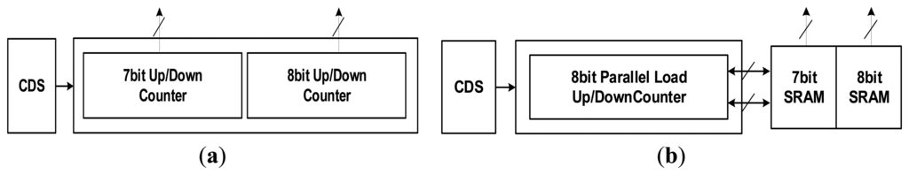 The digital CDS performs a normal CDS processing by using a digital method, which means that the method of noise reduction is employed in a digital domain by converting the reset voltage and the signal voltage into a digital code. Figure 6a shows the block diagram for the conventional digital CDS. To implement a digital CDS, two up-down counters for the 7-bit coarse ADC and the 8-bit fine ADC are required as well as an analog CDS. The extra 1-bit of fine ADC is used for the digital correction logic (DCL) [8,14]. Such an up-down counter has an advantage in that it reduces unnecessary circuits, because the counter plays a role as the subtractor and memory itself. However, it is difficult to apply the up-down counter within a limited column pitch because the layout area of the counter is large. To compensate for this phenomenon, a digital CDS structure for the proposed 14-bit TS SS ADC is shown in Figure 6b. The structure is comprised of both an 8-bit up-down counter (including the DCL bit) with a parallel load which designates the initial value of the counter and two SRAMs. The SRAMs are designed with 7-bit and 8-bit. Since the layout area to implement the 1-bit is significantly smaller for the SRAM than for the counter, we can have a smaller size than that of the conventional structure by more than 10%.