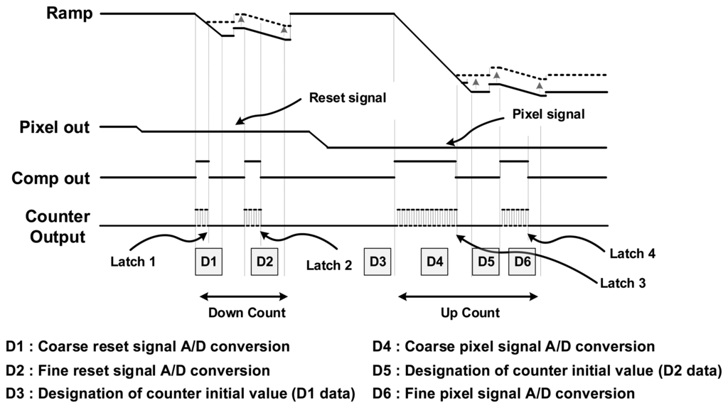 Figure 7 shows the timing diagram which illustrates the proposed digital CDS operation. First, the A/D conversion of the reset signal is performed at both the coarse block and the fine block, and the converted data values are stored to each SRAM. After that, the digital values stored in the memory are set to the initial values of the counter. Then, from the initial values, the counting starts in reverse order of the reset signal, in order to perform the same action with the conventional up-down counter. Finally, the A/D conversion of the signal voltage is performed at both the coarse block and the fine block.