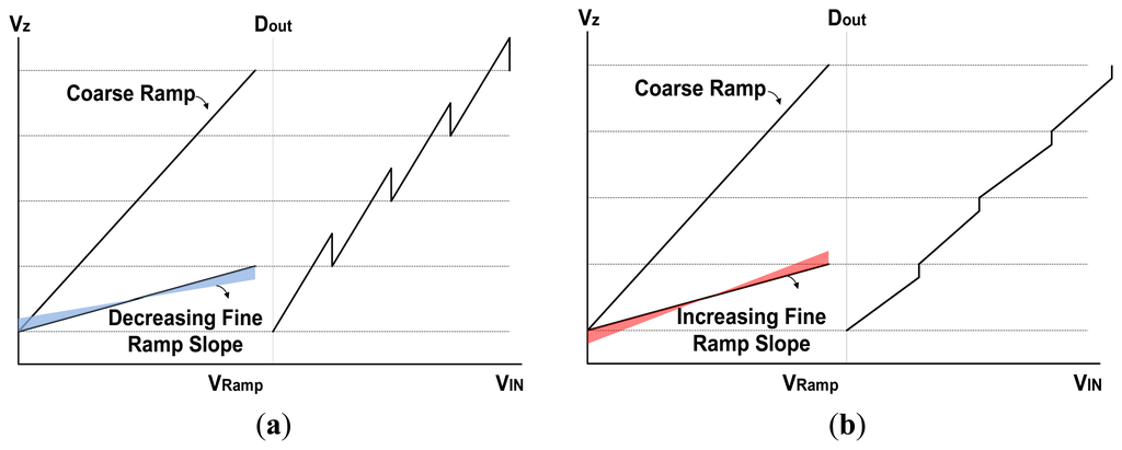 Figure 2b shows the conceptual diagram of ramp slope change by the parasitic capacitances. It generates the difference of slope ratio between the coarse ramp and the fine ramp. Such difference in the slope ratio degrades the linearity of the ADC which is the most important part in the CMOS image sensor. Further, the column fixed pattern noise (CFPN) becomes serious because the parasitic capacitance is differently formed in every column. Normally, since the metal routing, device mismatching, and other side effects of each column are different, the value of parasitic capacitances of each column is also different. Thus the gain and linearity of each column ADC are also different. For those reasons, in case of the conventional TS SS ADC, it is very difficult to obtain a high resolution beyond 10-bit, and additionally, the linearity is much worse than that of SS ADC.