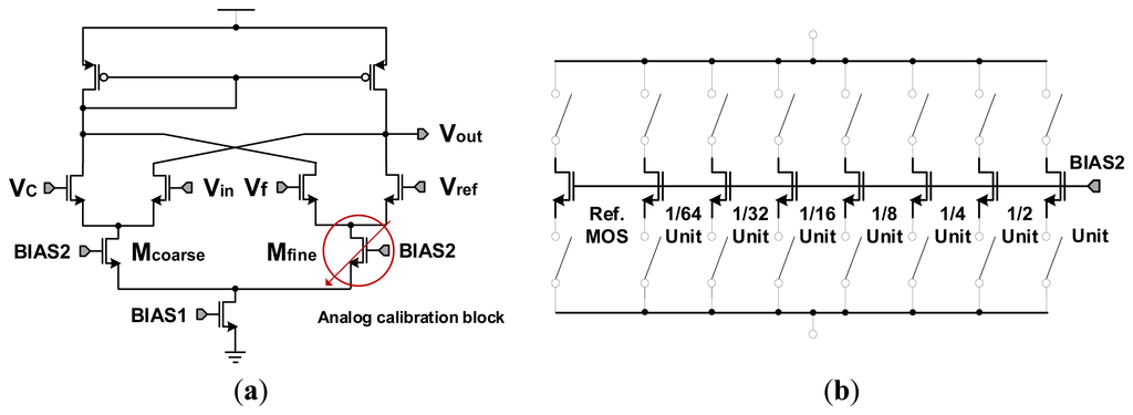 Figure 9a shows the circuit diagram of the 4-input comparator with a self-calibration. Here, the currents at Mcoarse and Mfine are not the same due to the mismatching of the two MOSs, causing an uneven analog gain and a difference in the slope ratio between the coarse ramp and the fine ramp. The study is focused on the analog calibration of Mfine that we change the gm value by adjusting the current amount on Mfine, in order to make the same analog gain at Mcoarse and Mfine.
