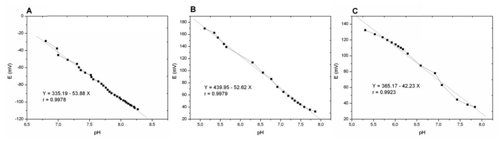 Figure 2 shows a simplified image of the three ion-selective membranes described above. The three sensor configurations were fabricated on the same kind of electrodes and measured in the same way. These membranes were tested and compared with potentiometric measurements of pH.