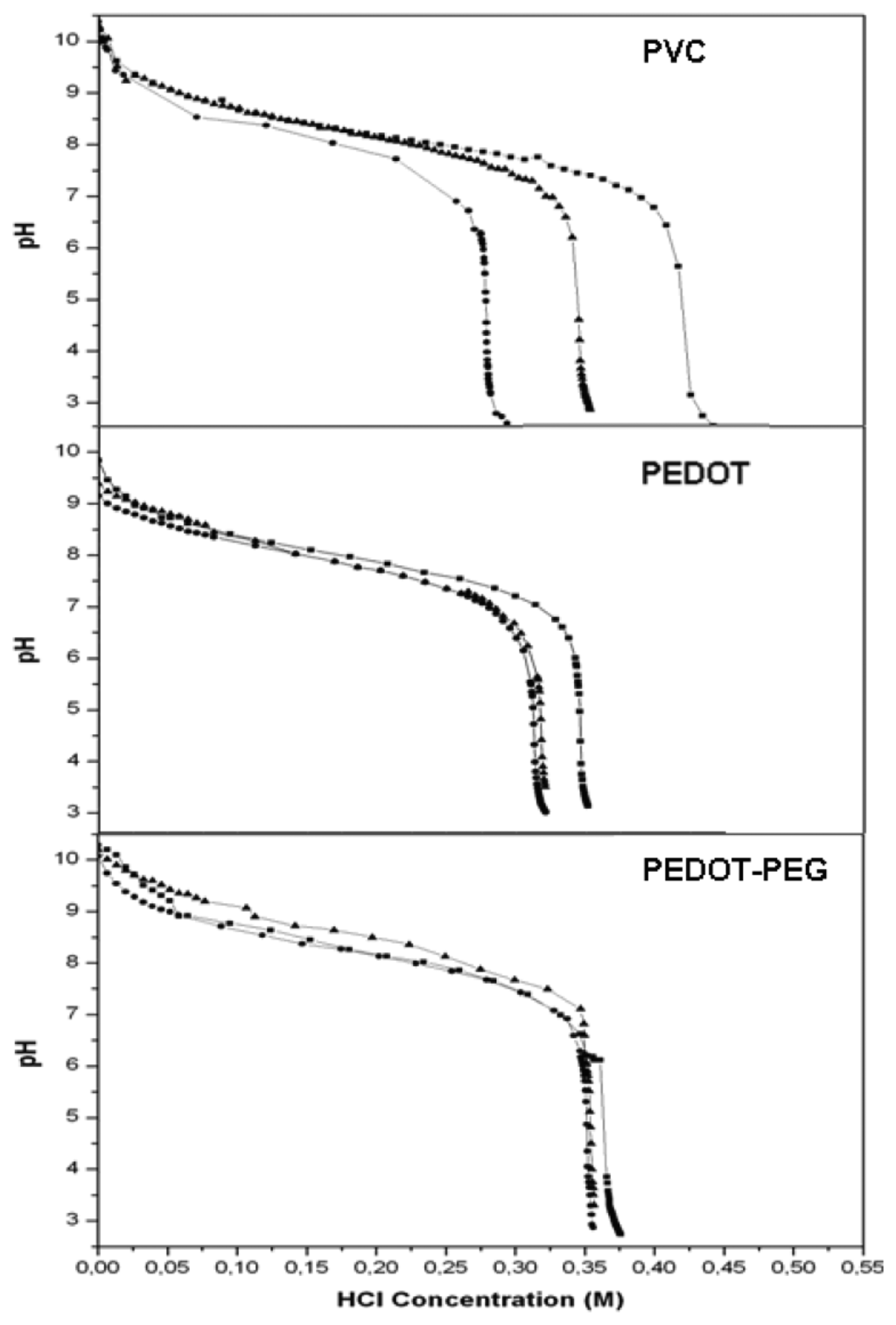 Few differences are observed on the slope of the linear response for the PVC commercial membrane and the PEDOT membrane, both exhibiting a near-Nernstian response (−53.88 and −52.62 mV/decade, respectively). In contrast, sub-Nernstian behavior (−42.23 mV/decade) was observed for sensors prepared with PEDOT-PEG membranes. The decrease in the response slope in hydrophilic and charge density surfaces, as in the case of this PEG-modified surface, has been reported on alkylsilane-modified potentiometric pH sensors [18,19]. As reported charged and conductive polymers have more difficulties to achieve a great selectivity in ISE membrane. However, this work is focused in the development of an ISE sensor that has to be inserted inside the body. So the essential issue was to assure a stability and harmlessness platform, being sensitive and selective enough for this specific application.