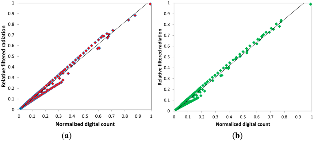 One common source of error in the measurements provided by an electronic device is the nonlinearity in the response of the digital channels that exist in the device. When this occurs, there are solutions based on artificial neural network models generation that improve the color signals from the sensor [20,21]. In this particular case, the TCS3414CS sensor has three channels, R, G, B and a fourth channel that is called Clear in which the sensor is exposed to radiation without any filter except an IR filtering component. To test the linearity of these channels an experimental device based on a video projector connected to a computer that generates light simulations of different RGB values projected onto the sensor. Also, together with the electronic device equipped with the sensor, a diffuse reflectance pattern [22] was produced on which the chromaticity coordinates of the light stimulation were measured using a Minolta CS-2000 tele-spectroradiometer controlled by the same computer.